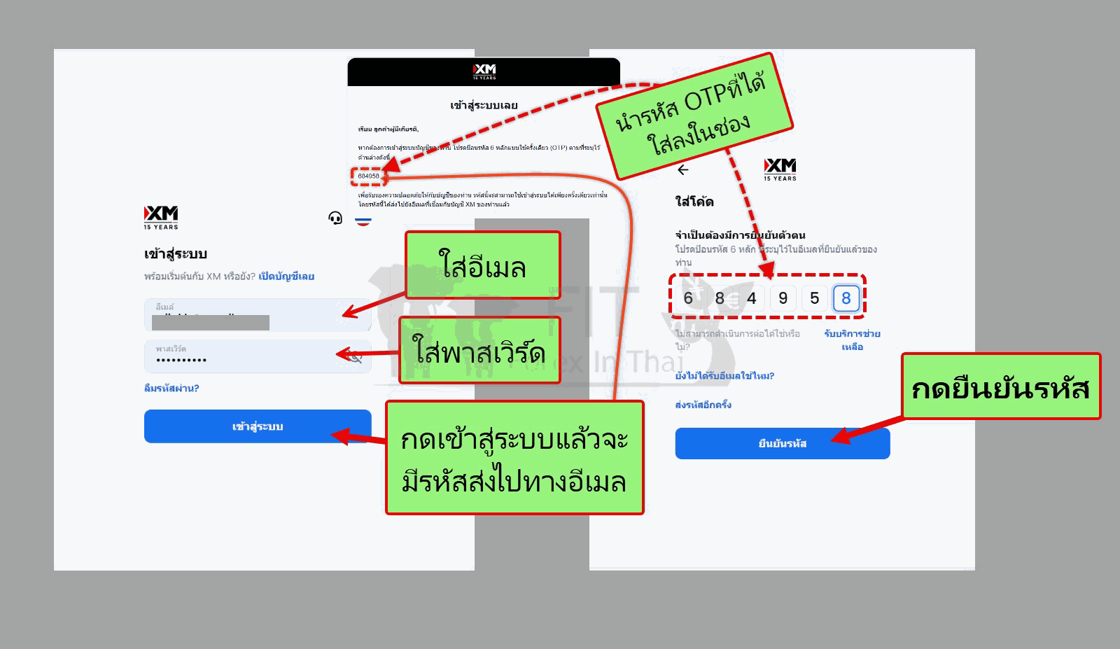 กดลิงก์เพื่อล็อกอิน เข้าสู่พื้นที่สมาชิก > กรอกอีเมลและพาสเวิร์ด  แล้วระบบจะส่งรหัสไปทางอีเมล  นำรหัส OTP ที่ได้ใส่ในช่องยืนยัน แล้วกดยืนยัน
