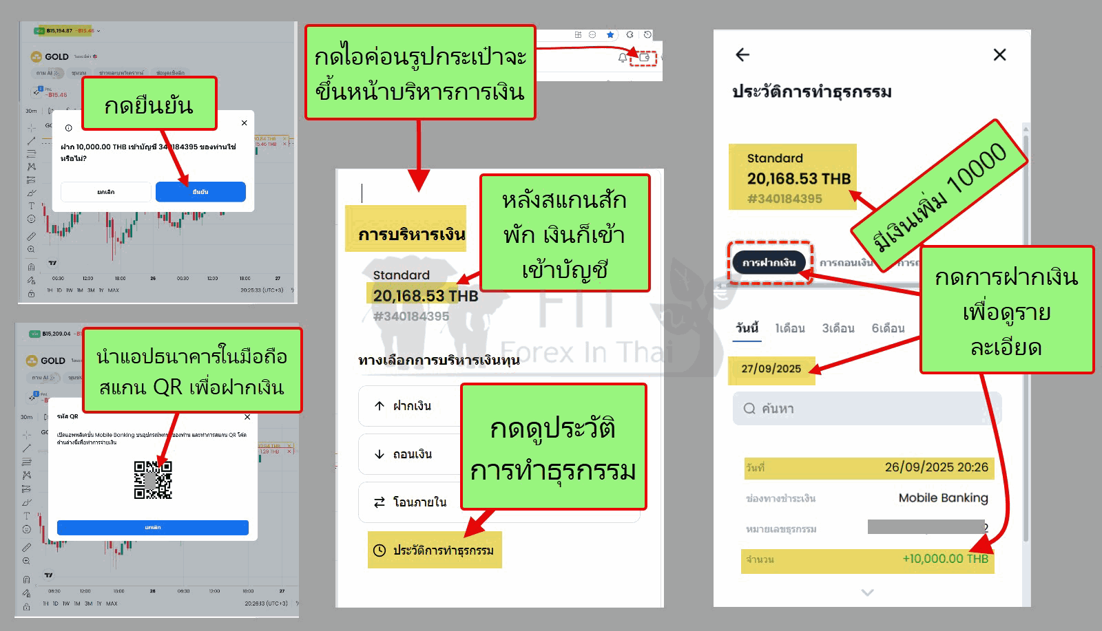 หลังจากสแกนฝากเงินสำเร็จ สักพัก เงินก็เข้าบัญชีเทรด เราสามารถตรวจสอบการฝากเงินย้อนหลังได้ โดยให้ไปที่