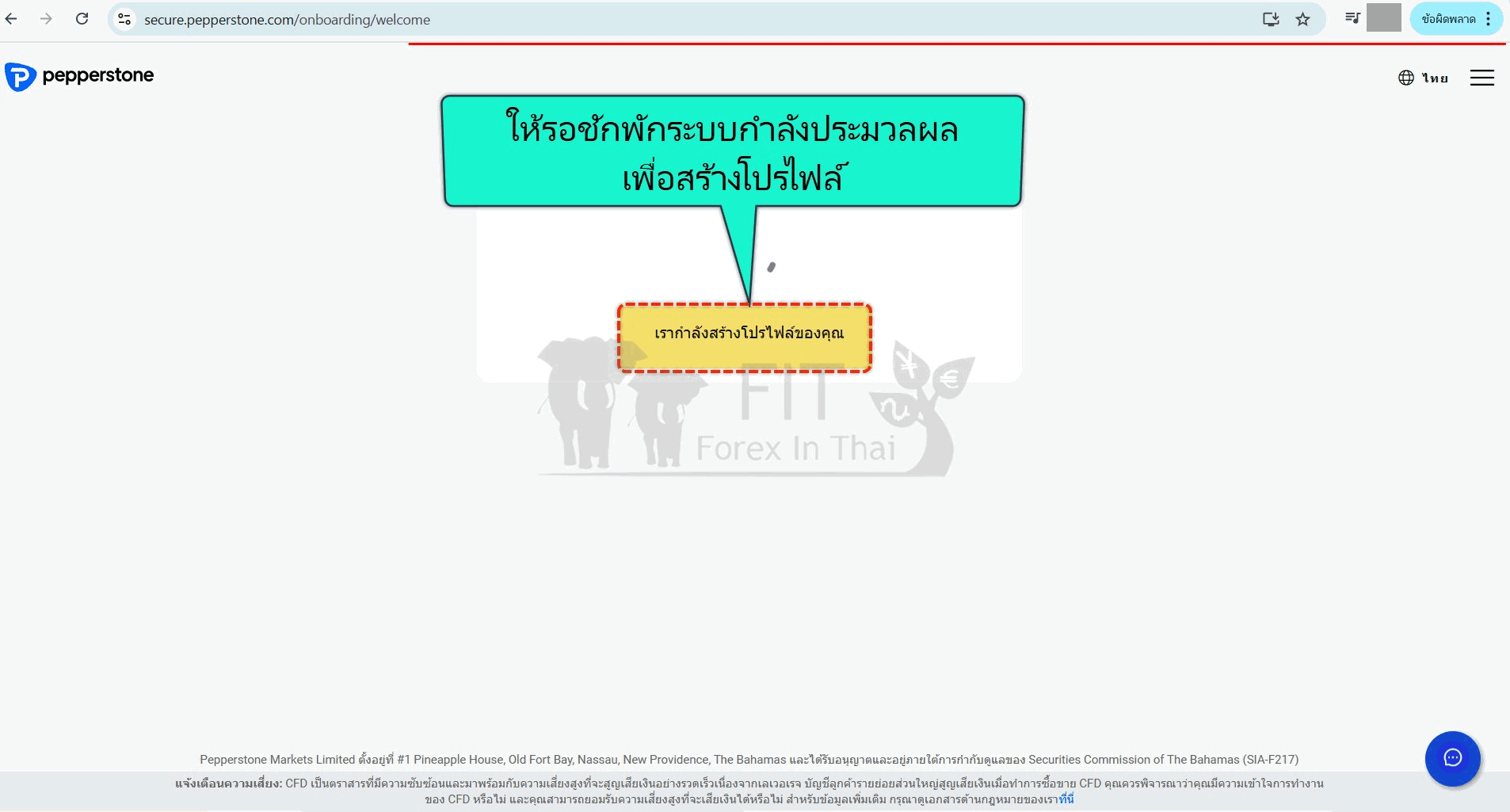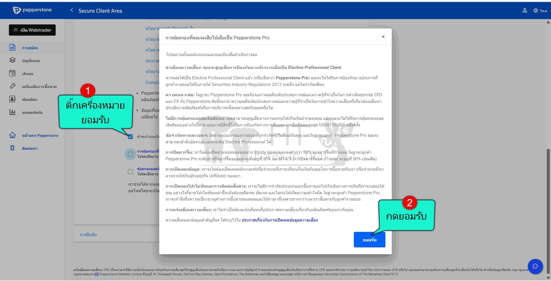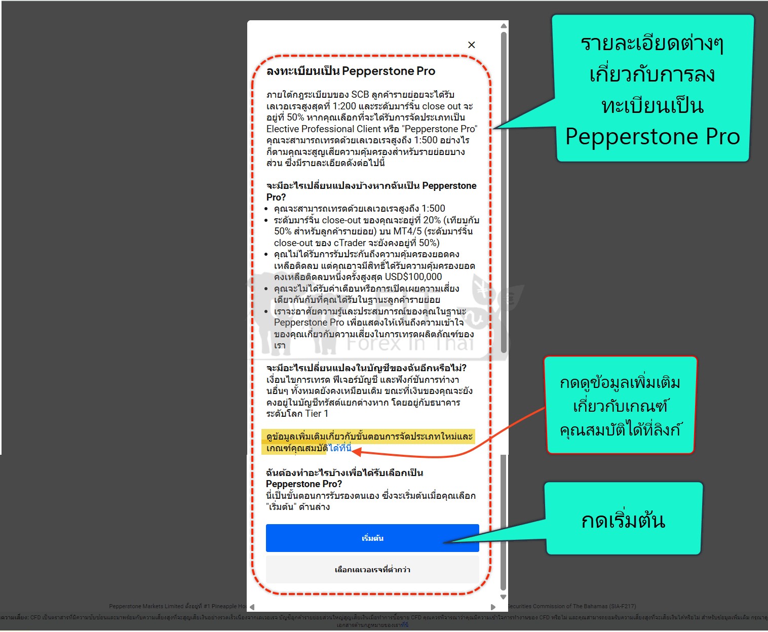 เนื่องด้วยทีมงานเลือกเลเวอเรจ มากว่า 1:200 จึงเป็นต้องลงทะเบียนเป็น Pepperstone Pro ระบบจึงรันมาที่หน้าชี้แจงรายละเอียด ให้เรากดเริ่มต้น