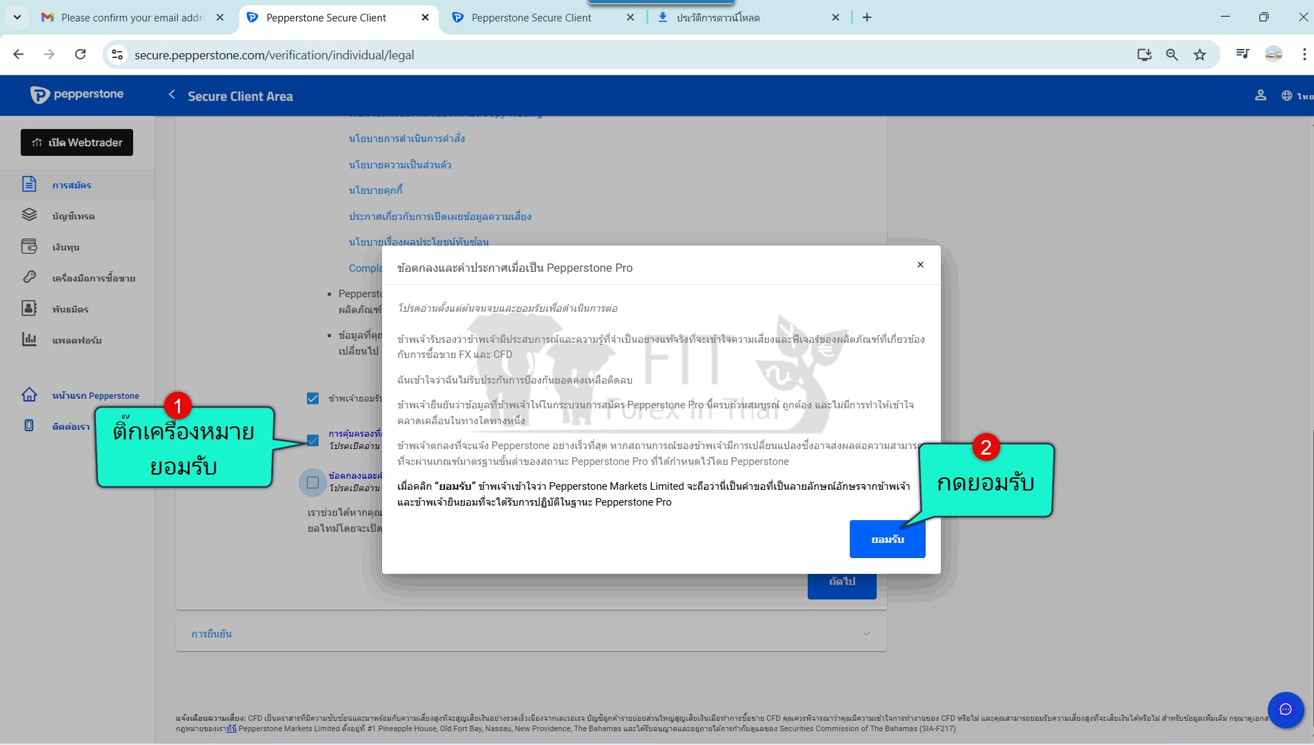 ตามตัวอย่าง ให้อ่านข้อมูลต่างๆ ตามที่ลูกศรชี้ จากนั้นลื่นสกอลลงด้านล่าง จะมีประกาศแจ้งรายละเอียด เกี่ยวกับเสี่ยง รวมทั้งเงื่อนไขต่างๆของโบรกเกอร์ เราสละเวลาอ่านสักพัก จากนั้นติ๊กเครื่องหมายถูกยอมรับ ใน 2 ช่องดังกล่าว แล้วกดถัดไป