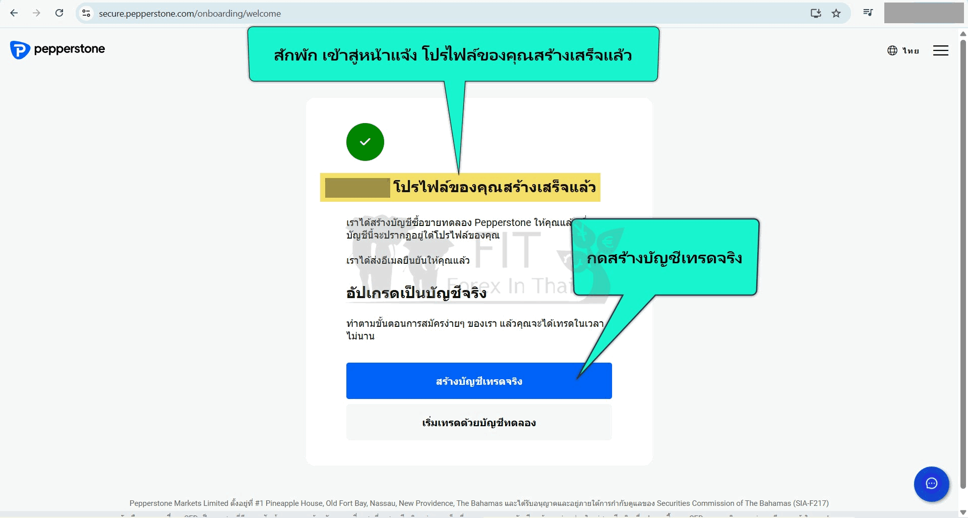 ตัวอย่าง ระบบแจ้ง โปรไฟล์ของเราได้ถูกสร้างแล้ว ให้เรากด สร้างบัญชีเทรดจริง
