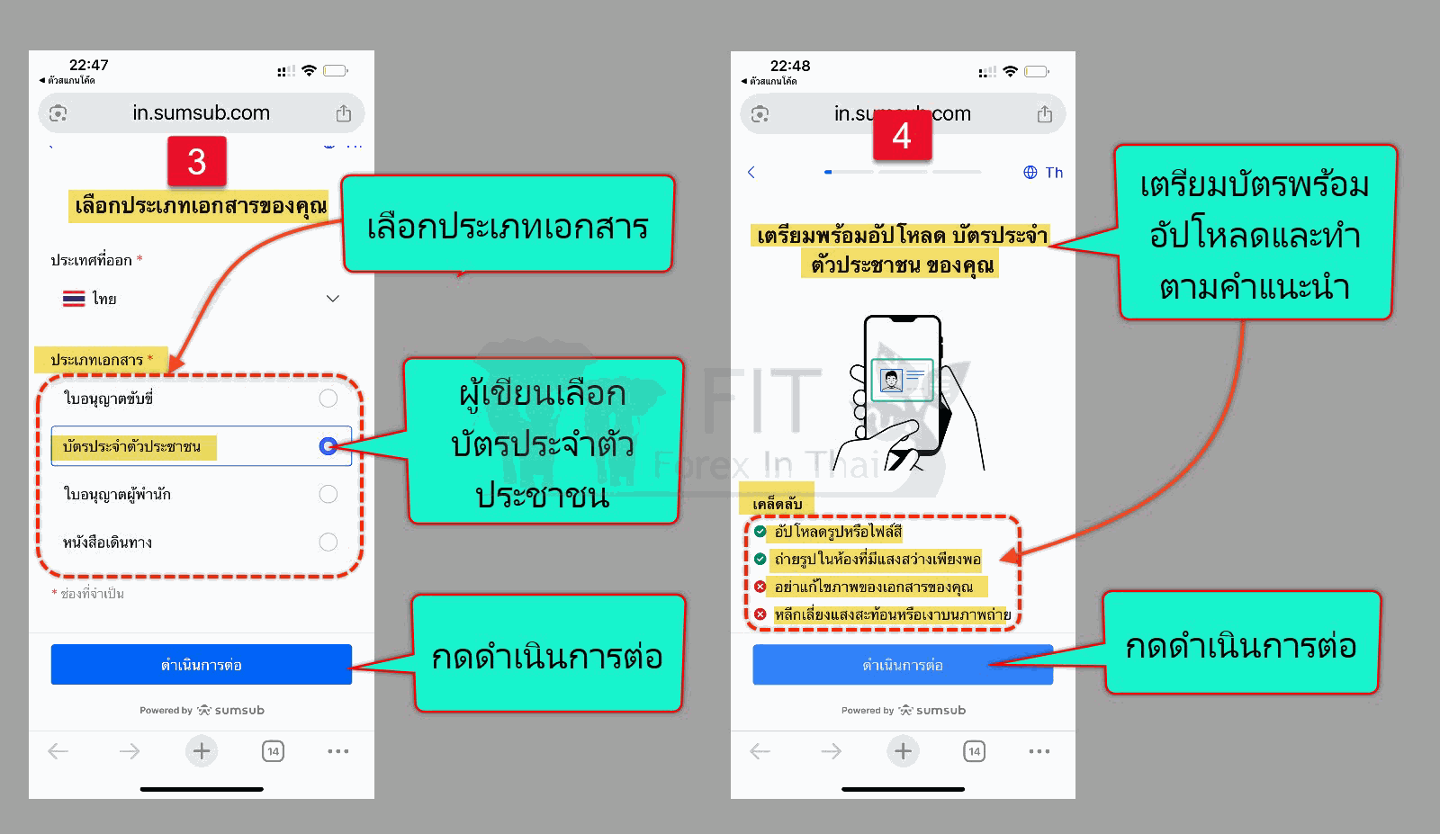 ตามตัวอย่าง ผู้เขียนเลือก กดบัตรประจำตัวประชาชน แล้วกดดำเนินการต่อ ไปที่หน้าแจ้งให้เตรียมความพร้อม อ่านแล้วทำตามคำแนะ แล้วกดดำเนินการต่อ
